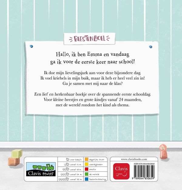 Hallo, ik ben Emma en vandaag ga ik voor de eerste keer naar school! Ik doe mijn lievelingsjurk aan voor deze bijzondere dag. Ik voel kriebels in mijn buik, maar ik heb er heel veel zin in! Ga je samen met mij naar de klas? Een lief en herkenbaar boekje over de spannende eerste schooldag. Voor kleine beestjes en grote kindjes vanaf 24 maanden, met de wereld rondom het kind als thema.
