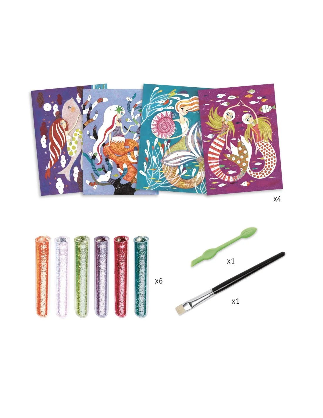 4 kleurplaten met charmante zeemeerminnen die met kleurrijke glitter worden verlicht. De kinderen leggen hun tekening in de doos, maken de voorgelijmde vlakken open met het meegeleverde gereedschap en bestrooien ze vervolgens met glitterpoeder volgens de kleurcode in het boekje. Aan het einde van de activiteit schitteren de zeemeerminnen, tot grote verbazing van de kinderen!