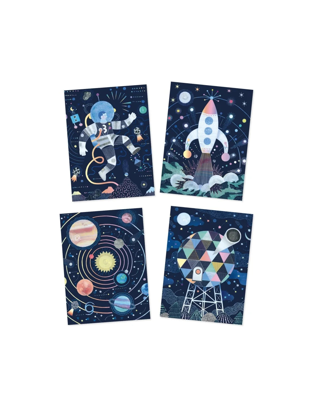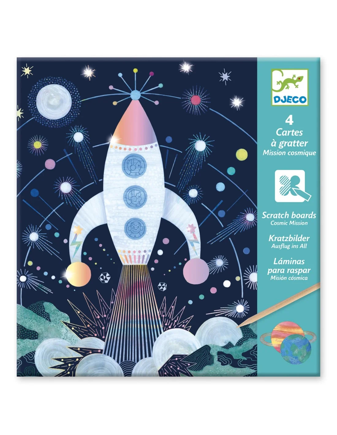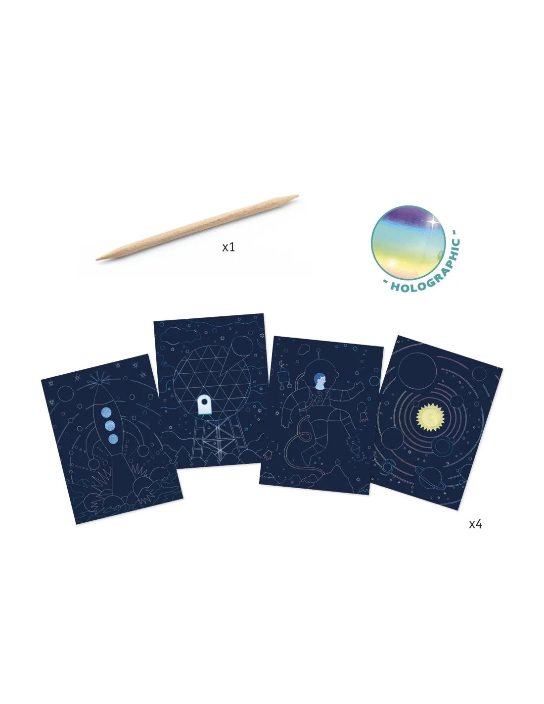 Een boekje met 4 iriserende kraskaarten met als thema de ruimte. Om de afbeeldingen te ontdekken, gaan de kinderen met het houten pennetje over de tekening van de artiest heen en krassen ze de bovenste laag weg. Geleidelijk aan worden als bij toverslag de tekeningen onthuld!
