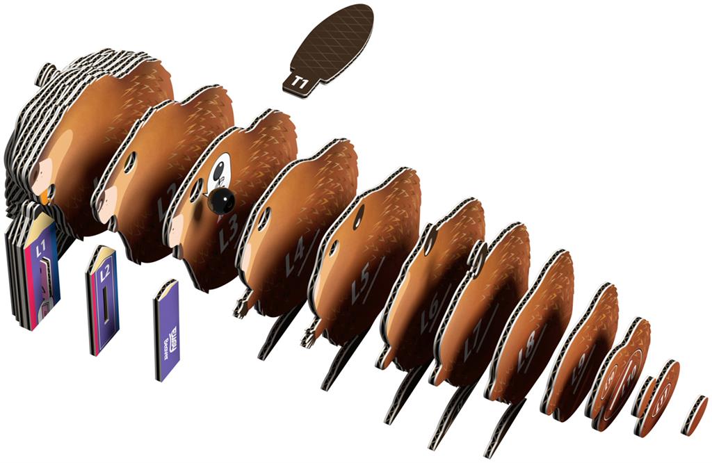 Bouw jouw eigen Eugy 3D-figuur! Dit leuke bouwpakket bestaat uit voorgesneden stukjes gerecycled karton die je eenvoudig met de bijgeleverde niet-giftige lijm op elkaar stapelt. Zo ontstaat er een stevig, kleurrijk en gedetailleerd figuurtje dat je met trots kunt neerzetten of cadeau doen.