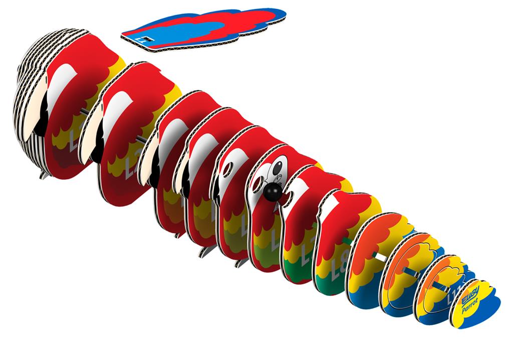 Bouw jouw eigen Eugy 3D-figuur! Dit leuke bouwpakket bestaat uit voorgesneden stukjes gerecycled karton die je eenvoudig met de bijgeleverde niet-giftige lijm op elkaar stapelt. Zo ontstaat er een stevig, kleurrijk en gedetailleerd figuurtje dat je met trots kunt neerzetten of cadeau doen.