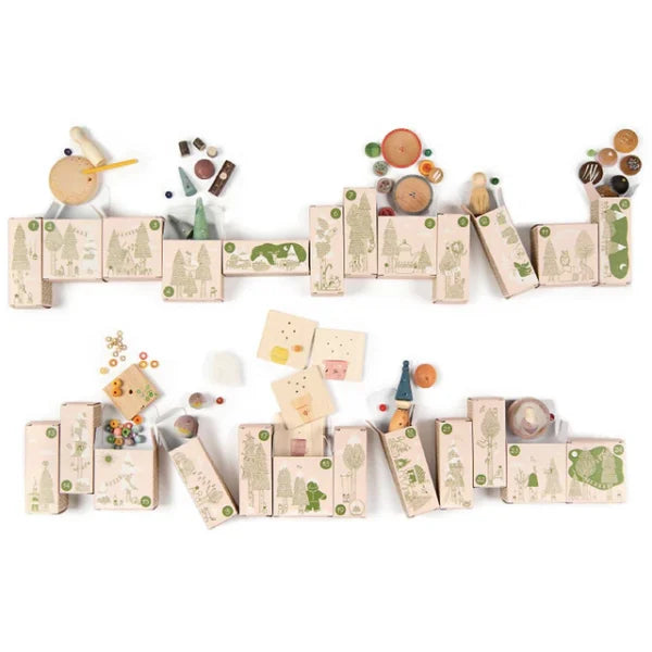- Inhoud: 24 doosjes met meer dan 180 onderdelen in verschillende materialen zoals hout, stof, draad, wol en meer