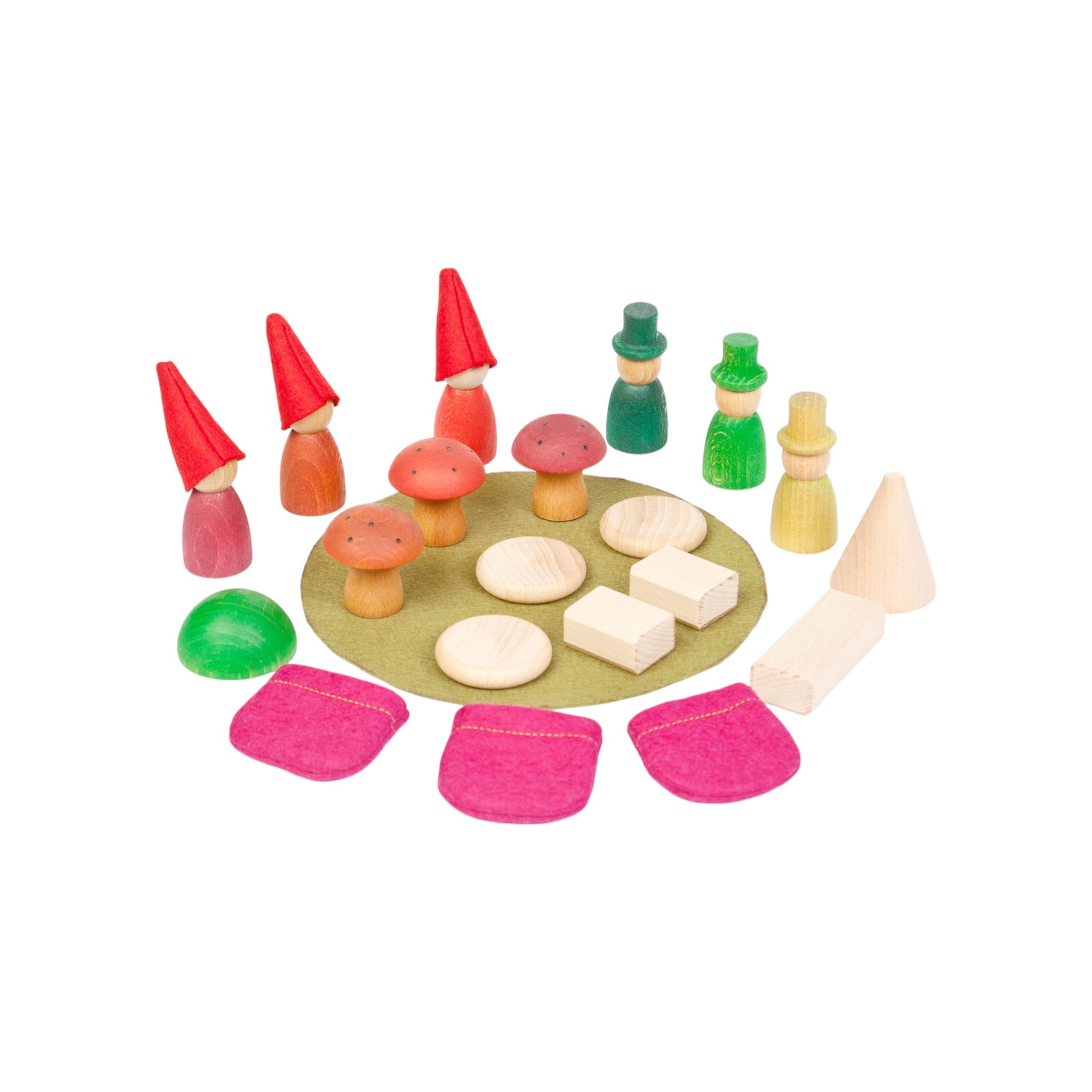Bevat 6 Nins, 3 Nins met een hoge hoed, 3 kleine vilten zakjes, 3 vilten kappen, 1 vilten cirkel, 1 halve maan, 1 kegel, 3 paddenstoelen, 3 munten, 2 kleine repen en 1 grote reep.