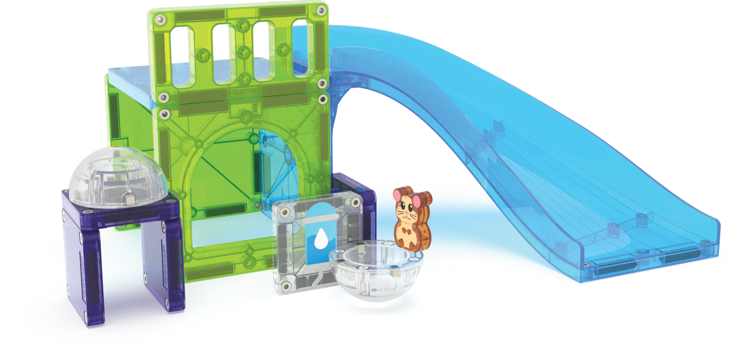 Deze set brengt beweging en creativiteit tot leven met de gloednieuwe Glijbaan-connector. Plaats het schattige hamstertje in zijn magnetische bal en kijk hoe hij vrolijk door bochten en hellingen rolt. Versier je bouwwerk met microMAGS-decoraties en laat je fantasie de vrije loop. De meegeleverde Hek- en Poortstukken geven structuur aan je ontwerp en helpen de hamster zijn weg te vinden – zodat het avontuur op de rails blijft!