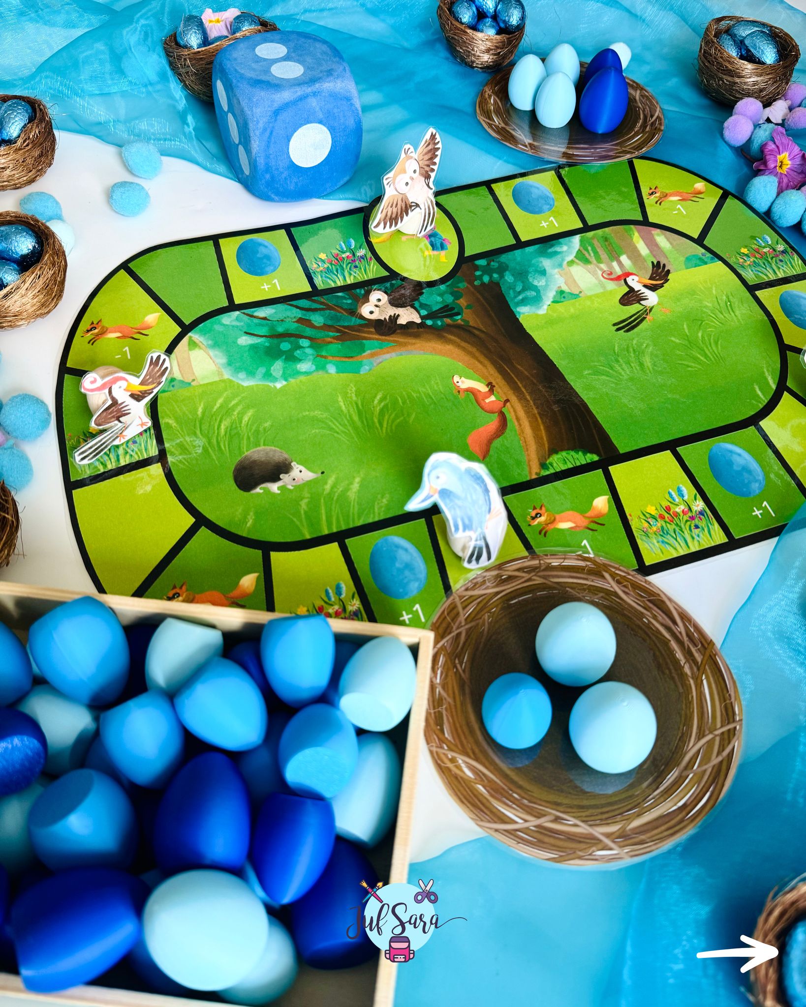 Deze set werd verwerkt in de bundel van Juf Sara: Pippa en het vreemde ei en kan gebruikt worden voor sorteren op kleur en formaat, patronen maken of gebruikt worden als loose parts in een sensorische box / tafel in het thema Pasen.