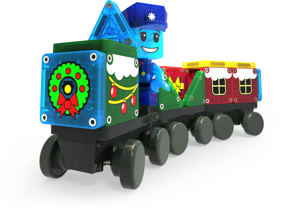 34 nieuwe feestelijke MAGNA-TILES, inclusief een Kerstman- en Conducteur-figuur, en een microChassis.