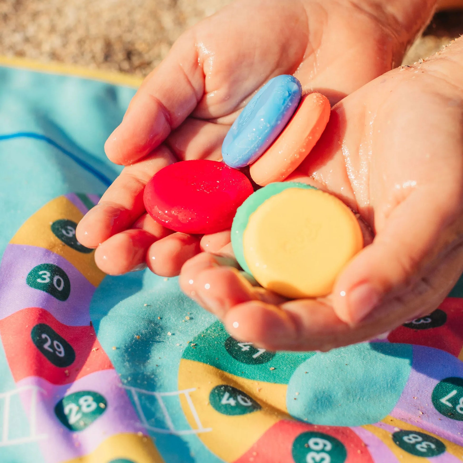 Gemaakt van zachte, sneldrogende microvezel en gecombineerd met siliconen pionnen, is het perfect om thuis te spelen, in restaurants, op vakantie, op het strand of bij het zwembad. Zand en spatten? Geen probleem.