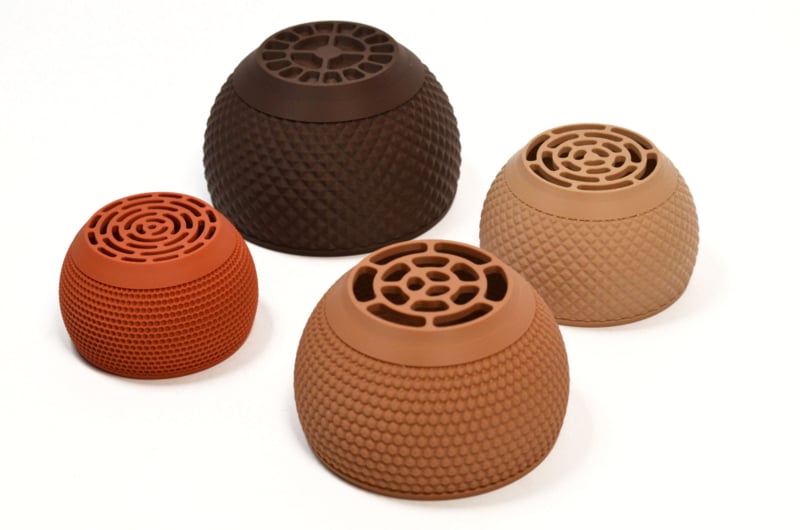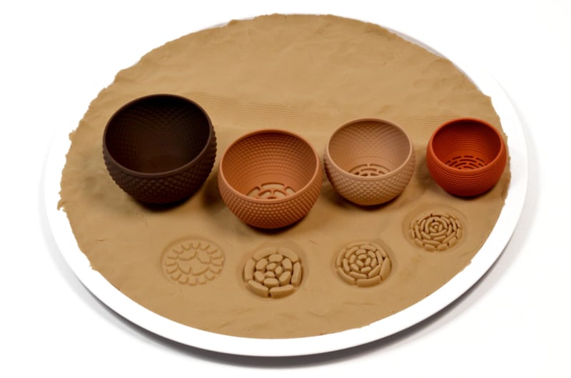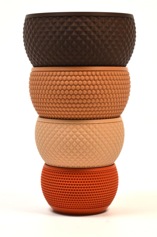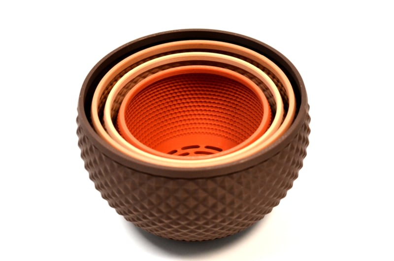 De structuren op de wanden prikkelen zowel oog als tastzin, een sensorische beleving. De setafbreekt dan traditionele plastics. bestaat uit vier kommen in verschillende formaten. Drie daarvan hebben een unieke zeefbodem die ook als stempel gebruikt kan worden.