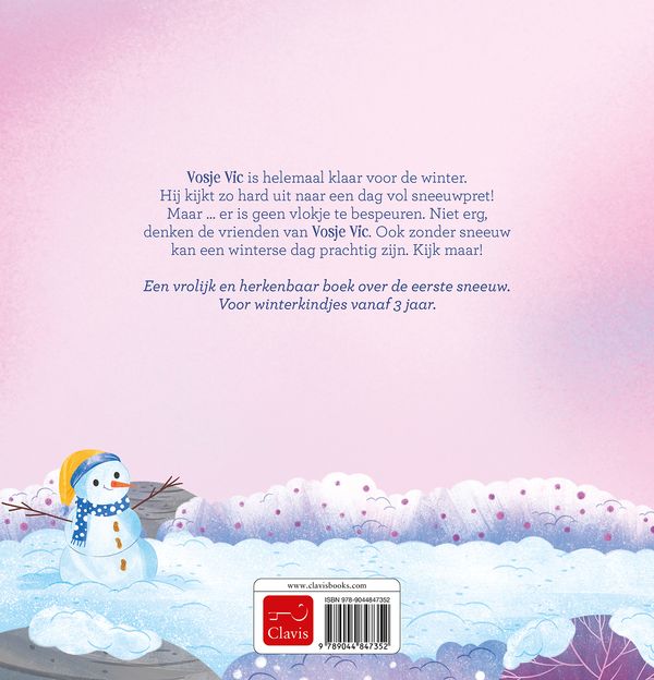 Vosje Vic is helemaal klaar voor de winter. Hij kijkt zo hard uit naar een dag vol sneeuwpret! Maar … er is geen vlokje te bespeuren. Niet erg, denken de vrienden van Vosje Vic. Ook zonder sneeuw kan een winterse dag prachtig zijn. Kijk maar! Een vrolijk en herkenbaar boek over de eerste sneeuw. Voor winterkindjes vanaf 3 jaar.